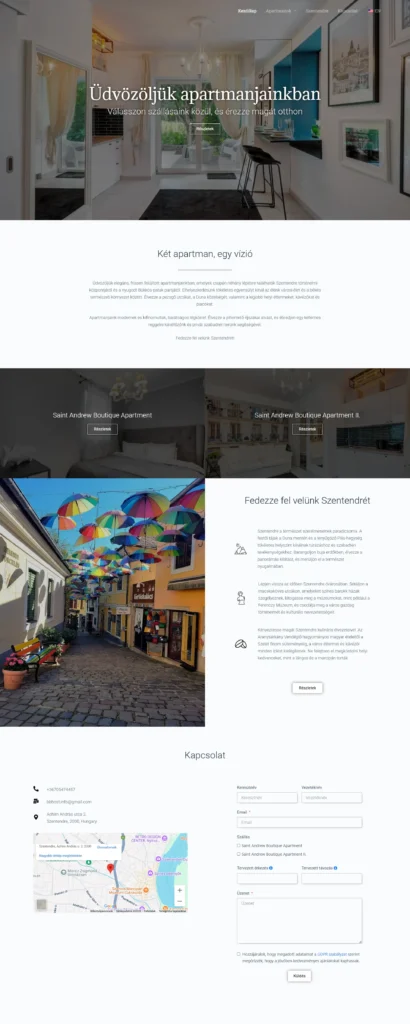 Egy letisztult, elegáns honlap készült ehhez a szentendrei apartmanprojekthez, amely a városi élet és a természet közelségét tükrözi. A cél egy barátságos, bizalmat ébresztő online jelenlét megalkotása volt, amely segíti a vendégek döntését és kiemeli a szálláshely egyediségét. A tartalom, arculat és felépítés egységes vízió mentén valósult meg.
